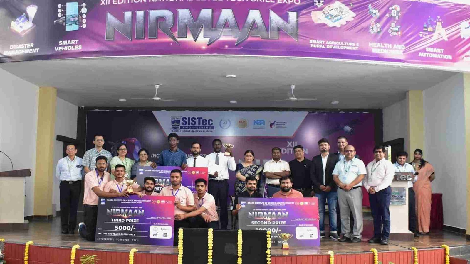 Sagar Group of Institutions-SISTec proudly hosted its prestigious event, "Nirmaan 2024 — National Level Tech-Skill Expo XII Edition". This tech-skill expo attracted technocrats from all over India who eagerly displayed their technical prowess through various models. Over 1000 aspiring technocrats from more than 50 institutions participated in the expo, introducing modernizations on a range of themes to create a fusion of technical innovations. The XII Edition of Nirmaan focused on 11 different themes, with students presenting inventive ideas and projects on topics such as Renewable Energy, Clean and Green Technologies, Waste Management, Disaster Management, Technical Innovations, Smart Vehicles, Smart Agriculture and Rural Development, Health and Medicine, Smart Automation, Robotics and Drones, Fintech, and other innovative domains aimed at solving real-life problems.